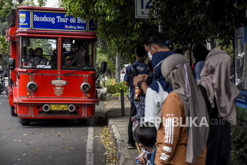 Sejumlah penumpang turun dari bus Bandung Tour On Bus (BANDROS) di Halte Bus Bandros di Jalan Diponegoro, Ahad (5/9). Bus wisata Bandung Tour On Bus (BANDROS) kembali beroperasi secara terbatas dengan menerapkan protokol kesehatan pencegahan Covid-19, seiring dengan menurunnya status Pemberlakuan Pembatasan Kegiatan Masyarakat (PPKM) di Kota Bandung menjadi Level 3. Foto: Republika/Abdan Syakura (FOTO : REPUBLIKA/ABDAN SYAKURA)