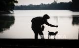 Warga bermain dengan kucing di tepi danau, kawasan Perkampungan Budaya Betawi Setu Babakan, Jagakarsa, Jakarta, Ahad (5/9/2021). Kawasan perkampungan tersebut terpilih menjadi salah satu dari 50 desa wisata terbaik di Indonesia oleh Kementerian Pariwisata dan Ekonomi Kreatif dalam dalam ajang Anugerah Desa Wisata Indonesia (ADWI) 2021. (FOTO : Antara/Aprillio Akbar)