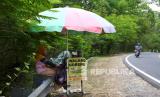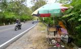 Penjual walang goreng / belalang goreng menunggu pembeli di kawasan Tahura Bunder, Jalan Wonosari, Gunungkidul, Yogyakarta, Senin (6/9). Makanan khas Gunungkidul ini hanya dijual di sekitar kawasan Tahura Bunder. Satu toples walang goreng ini dijual dengan harga Rp 25 ribu. Namun sejak pandemi Covid-19 pedagang mengaku penjualan turun drastis hingga 80 persen. (FOTO : Wihdan Hidayat / Republika)
