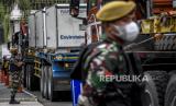 Anggota TNI berjaga di dekat envirotainer yang membawa vaksin Covid-19 Sinovac setibanya di PT Bio Farma (Persero), Jalan Pasteur, Kota Bandung, Senin (6/9). Sebanyak 5 juta dosis vaksin Covid-19 siap pakai produksi Sinovac, China, tiba di PT Bio Farma (Persero) untuk selanjutnya diproses. Hingga saat ini, jumlah total vaksin Covid-19 yang telah tiba di Indonesia sebanyak 225,4 juta dosis vaksin dari berbagai merk. Foto: Republika/Abdan Syakura (FOTO : REPUBLIKA/ABDAN SYAKURA)