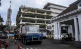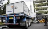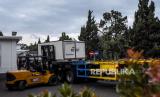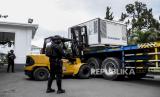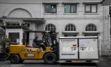 Petugas menggunakan alat berat membawa envirotainer yang berisi vaksin Covid-19 Sinovac setibanya di PT Bio Farma (Persero), Jalan Pasteur, Kota Bandung, Senin (6/9). Sebanyak 5 juta dosis vaksin Covid-19 siap pakai produksi Sinovac, China, tiba di PT Bio Farma (Persero) untuk selanjutnya diproses. Hingga saat ini, jumlah total vaksin Covid-19 yang telah tiba di Indonesia sebanyak 225,4 juta dosis vaksin dari berbagai merk. (FOTO : REPUBLIKA/ABDAN SYAKURA)