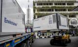 Petugas menggunakan alat berat menurunkan envirotainer yang berisi vaksin Covid-19 Sinovac setibanya di PT Bio Farma (Persero), Jalan Pasteur, Kota Bandung, Senin (6/9). Sebanyak 5 juta dosis vaksin Covid-19 siap pakai produksi Sinovac, China, tiba di PT Bio Farma (Persero) untuk selanjutnya diproses. Hingga saat ini, jumlah total vaksin Covid-19 yang telah tiba di Indonesia sebanyak 225,4 juta dosis vaksin dari berbagai merk. (FOTO : REPUBLIKA/ABDAN SYAKURA)