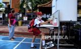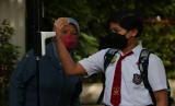 Pelajar mengecek suhu badannya sebelum memasuki ruang kelas di SDN Kaliasin I, Surabaya, Jawa Timur, Senin (6/9/2021). Pemkot Surabaya memulai pembelajaran tatap muka (PTM) tingkat Sekolah Dasar (SD) dan Sekolah Menengah Pertama (SMP) secara terbatas dengan menerapkan protokol kesehatan secara ketat (FOTO : ANTARA/Didik Suhartono)