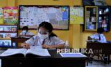 Siswa mengikuti kegiatan Pendampingan Tatap Muka di SD Widiatmika, Jimbaran, Badung, Bali,Senin (6/9/2021). Sekolah tersebut memulai program pendampingan pembelajaran tatap muka di sekolah yang dilaksanakan secara terbatas dengan diikuti maksimal lima orang siswa dalam satu kelas yang menerapkan protokol kesehatan secara ketat untuk menunjang proses pembelajaran jarak jauh secara daring. (FOTO : Antara/Fikri Yusuf)