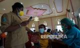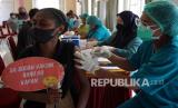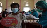 REPUBLIKA.CO.ID, SORONG -- Petugas memberikan semangat kepada pelajar saat vaksinasi di Sorong, Papua Barat, Selasa (7/9/2021). Dinas Kesehatan Provinsi Papua Barat mencatat vaksinasi COVID-19 di Papua Barat hingga Senin (6/9/2021) mencapai 42,4 persen dari total sasaran sebanyak 797.402 orang.