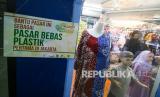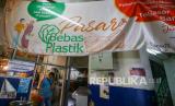 REPUBLIKA.CO.ID, JAKARTA -- Pedagang melintas di dekat papan informasi "Pasar Bebas Plastik" di Pasar Tebet Barat, Jakarta, Selasa (7/9/2021). Pasar Tebet menjadi penyumbang terbesar dalam kontribusinya menurunkan penggunaan kantong plastik di DKI Jakarta.