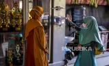 Murid melakukan pemeriksaan suhu tubuh sebelum memasuki area sekolah saat hari pertama pembelajaran tatap muka (PTM) di SD Ar Rafi, Jalan Sekejati, Kiaracondong, Kota Bandung, Rabu (8/9). Pemerintah Kota Bandung kembali menggelar pembelajaran tatap muka (PTM) secara terbatas di 330 sekolah yang meliputi PAUD/TK, SD, SMP dan SMA dengan menerapkan protokol kesehatan ketat serta membatasi jumlah murid sebanyak 50 persen dari kapasitas kelas dan sisanya mengikuti pembelajaran secara daring. Foto: Republika/Abdan Syakura (FOTO : REPUBLIKA/ABDAN SYAKURA)