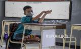 Murid mengikuti kegiatan belajar mengajar saat hari pertama pembelajaran tatap muka (PTM) di SD Ar Rafi, Jalan Sekejati, Kiaracondong, Kota Bandung, Rabu (8/9). Pemerintah Kota Bandung kembali menggelar pembelajaran tatap muka (PTM) secara terbatas di 330 sekolah yang meliputi PAUD/TK, SD, SMP dan SMA dengan menerapkan protokol kesehatan ketat serta membatasi jumlah murid sebanyak 50 persen dari kapasitas kelas dan sisanya mengikuti pembelajaran secara daring. Foto: Republika/Abdan Syakura (FOTO : REPUBLIKA/ABDAN SYAKURA)