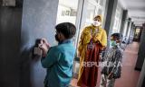 Seorang guru mengarahkan murid untuk melakukan pemeriksaan suhu saat hari pertama pembelajaran tatap muka (PTM) di SD Ar Rafi, Jalan Sekejati, Kiaracondong, Kota Bandung, Rabu (8/9). Pemerintah Kota Bandung kembali menggelar pembelajaran tatap muka (PTM) secara terbatas di 330 sekolah yang meliputi PAUD/TK, SD, SMP dan SMA dengan menerapkan protokol kesehatan ketat serta membatasi jumlah murid sebanyak 50 persen dari kapasitas kelas dan sisanya mengikuti pembelajaran secara daring. Foto: Republika/Abdan Syakura (FOTO : REPUBLIKA/ABDAN SYAKURA)