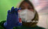 Tenaga kesehatan puskesmas Kecamatan Menteng menujukan sampel lendir warga usai melakukan tes usap antigen dan PCR gratis dalam pelaksaan Program Swab Seru Keliling (Seruling) di Masjid Jami Assuhaimiah, Kebon Sirih, Jakarta, Kamis (9/9). Program ini diharapkan dapat memutus penularan Covid-19 dari pasien tanpa gejala.Prayogi/Republika (FOTO : Prayogi/Republika.)