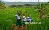 Sejumlah siswa berjalan kaki melintasi pematang sawah saat pulang ke rumah di Dusun Ciakar, Kabupaten Ciamis, Jawa Barat, Kamis (9/9/2021). Pemerintah Provinsi Jawa Barat meluncurkan program Ngabring ka Sakola (Ngabaso) atau gerakan berjalan kaki ke sekolah secara berkelompok agar tercipta rasa aman dan selamat bagi anak, saat pergi ke sekolah dan pulang ke rumah. (FOTO : Antara/Adeng Bustami)