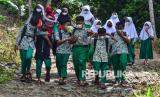 Sejumlah siswa berjalan kaki saat pulang ke rumah di Dusun Ciakar, Kabupaten Ciamis, Jawa Barat, Kamis (9/9/2021). Pemerintah Provinsi Jawa Barat meluncurkan program Ngabring ka Sakola (Ngabaso) atau gerakan berjalan kaki ke sekolah secara berkelompok agar tercipta rasa aman dan selamat bagi anak, saat pergi ke sekolah dan pulang ke rumah. (FOTO : Antara/Adeng Bustami)