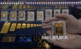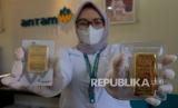 REPUBLIKA.CO.ID, DENPASAR -- Kepala Butik Emas LM Antam Denpasar Sarah Aprilia Roscantika menunjukkan emas Antam di Butik Emas Logam Mulia Antam Denpasar Bali, Kamis (9/9/2021).