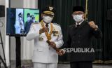 REPUBLIKA.CO.ID,BANDUNG -- Gubernur Jawa Barat Ridwan Kamil berfoto bersama Wali Kota Tasikmalaya Muhammad Yusuf saat upacara pengambilan sumpah jabatan dan pelantikan Wali Kota Tasikmalaya di Gedung Sate, Kota Bandung, Jumat (10/9).