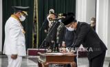 Gubernur Jawa Barat Ridwan Kamil (kanan) menandatangani pakta integritas Wali Kota Tasikmalaya Muhammad Yusuf (kiri) saat upacara pengambilan sumpah jabatan dan pelantikan Wali Kota Tasikmalaya di Gedung Sate, Kota Bandung, Jumat (10/9). Muhammad Yusuf dilantik sebagai Wali Kota Tasikmalaya oleh Gubernur Jawa Barat Ridwan Kamil dengan sisa masa jabatan periode 2017-2022. Foto: Republika/Abdan Syakura (FOTO : REPUBLIKA/ABDAN SYAKURA)