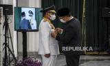 Gubernur Jawa Barat Ridwan Kamil (kanan) menyematkan tanda jabatan kepada Wali Kota Tasikmalaya Muhammad Yusuf (kiri) saat upacara pengambilan sumpah jabatan dan pelantikan Wali Kota Tasikmalaya di Gedung Sate, Kota Bandung, Jumat (10/9). Muhammad Yusuf dilantik sebagai Wali Kota Tasikmalaya oleh Gubernur Jawa Barat Ridwan Kamil dengan sisa masa jabatan periode 2017-2022. (FOTO : REPUBLIKA/ABDAN SYAKURA)