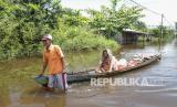 Warga menggunakan perahu untuk melintasi banjir yang merendam permukiman sekitar rumahnya di Jalan Kelud, Kasongan, Kabupaten Katingan, Kalimantan Tengah, Jumat (10/9/2021). Sebanyak enam kabupaten di Kalimantan Tengah menetapkan status tanggap darurat bencana banjir dari total 11 Kabupaten/Kota yang dilanda bencana itu sejak Sabtu (21/8). (FOTO : Antara/Makna Zaezar)