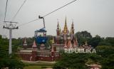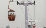 Pengunjung menaiki wahana kereta gantung di kawasan Taman Mini Indonesia Indah (TMII), Jakarta, Ahad (12/9). Kementerian Pariwisata dan Ekonomi Kreatif memberikan izin sejumlah tempat wisata untuk menggelar uji coba pembukaan tempat wisata di Jakarta diantaranya Taman Mini Indonesia Indah (TMII), Ancol, dan Setu Babakan. Taman Mini Indonesia Indah (TMII) membuka sejumlah wahana pada masa ujicoba dengan membatasi kapasitas maksimum 50 persen serta penerapan protokol kesehatan yang ketat. (FOTO : Republika/Thoudy Badai)
