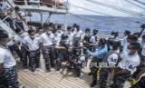Taruna Akademi Angkatan Laut (AAL) Tingkat III Angkatan ke-68 melakukan latihan praktek Visit Board Search Seizure (VBSS) di Geladak Utama KRI Bima Suci, Perairan Sulawesi, Sulawesi Utara, Sabtu (11/9/2021). Latihan VBSS digunakan untuk tindakan pendekatan, pengeledahan, penyergapan dan pemeriksaan untuk operasi pembebasan sandera serta pengecekan kapal yang mencurigakan. (FOTO : ANTARA/Muhammad Adimaja)