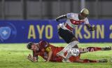Pesepak bola Madura United FC Rafael Silva terjatuh saat berebut bola dengan pesepak bola PSM Makassar dalam lanjutan Liga 1 2021-2022 di Stadion Madya Gelora Bung Karno, Jakarta, Ahad (12/9/2021). (FOTO : ANTARA/Galih Pradipta)