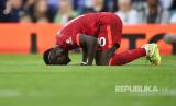 Sadio Mane bersujud syukur setelah mencetek gol ketiga Liverpool pada Liga Premier Inggris antara Leeds United dan Liverpool di Elland Road, Leeds, Inggris, Ahad, (12/9). (FOTO : REUTERS/Peter Powell)