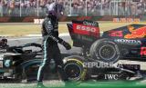Pembalap Mercedes Lewis Hamilton dari Inggris berjalan pergi setelah menabrak pembalap Red Bull Max Verstappen dari Belanda selama Grand Prix Formula Satu Italia, di arena pacuan kuda Monza, di Monza, Italia, Ahad (12/9). (FOTO : AP/Luca Bruno)