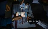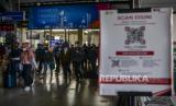 Calon penumpang memindai kode batang (QR Code) untuk menaiki KRL di Stasiun Bogor, Kota Bogor, Jawa Barat, Senin (13/9). PT KAI Commuter mulai memberlakukan sertifikat vaksin sebagai syarat untuk naik KRL pada masa PPKM level 3. (FOTO : Republika/Putra M. Akbar)