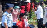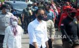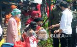 REPUBLIKA.CO.ID, KLATEN -- Presiden Joko Widodo (kanan) membeli makanan ringan dari warga saat meninjau vaksinasi COVID-19 di Ngledok, Segaran, Delanggu, Klaten, Jawa Tengah, Senin (13/9/2021).