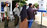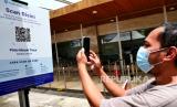 Wisatawan memindai barcode dengan aplikasi peduli lindungi di Gembira Loka Zoo (GL Zoo) saat uji coba pembukaan, Yogyakarta, Senin (13/9). GL Zoo menjadi salah satu destinasi wisata yang menjadi ujicoba pembukaan oleh pemerintah saat PPKM Level 3. Namun, wisatawan harus lolos pindai barcode aplikasi peduli lindungi. Atau wisatawan yang sudah divaksin, sehingga untuk anak-anak belum bisa. Selain GL Zoo di Yogyakarta yang mendapat lampu hijau pembukaan destinasi wisata yakni Tebing Breksi dan Hutan Pinus Mangunan. (FOTO : Wihdan Hidayat / Republika)