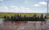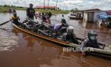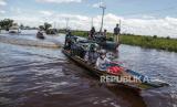 REPUBLIKA.CO.ID,PULANG PISAU -- Pengendara motor melintasi banjir menggunakan perahu bermesin (klotok) di jalan trans Kalimantan Bukit Rawi, Pulang Pisau, Kalimantan Tengah, Senin (13/9/2021).