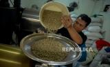 Pekerja menunjukan biji kopi saat proses roasting di tempat produksi Dunia Kopi di Pasar Santa, Jakarta, Selasa (14/9). Kios kopi milik Suradi tersebut berdiri sejak tahun 2000 dengan menyediakan beragam jenis kopi Nusantara yang dipasarkan hingga mancanegara seperti Jepang, Korea, Rusia, Jerman hingga Arab Saudi. Dalam sehari Toko Dunia Kopi mampu menjual sebanyak 300 kilogram hingga 2 ton dengan harga mulai dari Rp70 hingga Rp200 ribu per kilo (FOTO : Republika/Thoudy Badai)