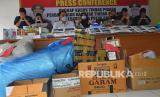 Anggota Ditreskrimsus Polda Banten menunjukkan barang bukti kejahatan perdagangan transaksi elektronik (ITE) saat ekspos di Mapolda Banten, Serang, Banten, Rabu (15/9/2021). Jajaran Polda Banten berhasil mengungkap kejahatan manipulasi transaksi elektronik dan meringkus empat tersangka pelakunya masing-masing BB, BD, HM dan AT yang sejak setahun terakhir berkomplot saling membeli dan menjual barang antar mereka secara fiktif melalui situs Tokopedia untuk meraih poin penjualan hingga mengakibatkan kerugian pengelola Tokopedia lebih dari Rp400 juta. (FOTO : Antara/Asep Fathulrahman)