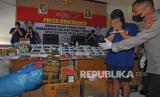 REPUBLIKA.CO.ID, SERANG -- Kabid Humas Polda Banten AKBP Shinto Silitonga (kanan) menunjukkan tersangka serta barang bukti kejahatan perdagangan transaksi elektronik (ITE) saat ekspos di Mapolda Banten, Serang, Banten, Rabu (15/9/2021).
