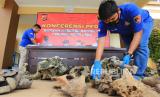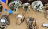 Personel kepolisian Polres Aceh Jaya menata barang bukti kerangka Gajah Sumatera saat konferensi pers di Mapolres Aceh Jaya, Aceh, Rabu (15/9/2021). Satreskrim Polres Aceh Jaya berhasil mengamankan 11 orang yang diduga sebagai pelaku pembunuhan lima ekor Gajah Sumatera di Desa Tuwie Peuriya Kecamatan Pasie Raya pada 1 Januari 2020, dan selanjutnya mereka dikenakan ancaman pidana kurungan penjara lima tahun dan denda paling banyak Rp 100 juta rupiah. (FOTO : ANTARA/Syifa Yulinnas)