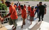 Personel kepolisian Polres Aceh Jaya menggiring tersangka pelaku pembunuhan Gajah Sumatera seusai konferensi pers di Mapolres Aceh Jaya, Aceh, Rabu (15/9/2021). Satreskrim Polres Aceh Jaya berhasil mengamankan 11 orang yang diduga sebagai pelaku pembunuhan lima ekor Gajah Sumatera di Desa Tuwie Peuriya Kecamatan Pasie Raya pada 1 Januari 2020, dan selanjutnya mereka dikenakan ancaman pidana kurungan penjara lima tahun dan denda paling banyak Rp 100 juta rupiah. (FOTO : ANTARA/Syifa Yulinnas)