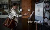 Pengunjung memindai kode batang (QR Code) saat akan menonton bioskop di CGV, Grand Indonesia, Jakarta, Kamis (16/9). Pemerintah Provinsi DKI Jakarta memberikan kelonggaran dengan diperbolehkannya bioskop untuk beroperasi kembali di masa PPKM level 3 dengan kapasitas pengunjung 50 persen, penggunaan aplikasi PeduliLindungi, telah divaksinasi Covid-19 dan penerapan protokol kesehatan yang ketat. Republika/Putra M. Akbar (FOTO : Republika/Putra M. Akbar)