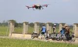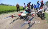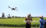 REPUBLIKA.CO.ID,INDRAMAYU -- Petani melihat teknisi saat mengoperasikan pesawat tanpa awak (Drone) yang digunakan untuk menyemprotkan cairan pestisida di areal sawah desa Krangkeng, Kecamatan Krangkeng, Indramayu, Jawa Barat, Kamis (16/9/2021).