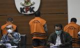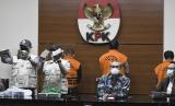 Wakil Ketua KPK Alexander Marwata (kedua kanan duduk) menghadirkan tersangka bersama barang bukti operasi tangkap tangan (OTT) KPK di Kalimantan Selatan saat konferensi pers di gedung KPK, Jakarta, Kamis (16/9/2021). KPK menetapkan tiga orang tersangka berinisial MK Plt Kadis PU pada Dinas PUPRT dan dua orang pihak swasta MRH dan FH terkait pengadaan barang dan jasa di Kabupaten Hulu Sungai Utara Tahun 2021-2022. (FOTO : ANTARA/Fakhri Hermansyah)