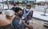 Petugas Diskes Lantamal XIII menyuntikan Vaksin Sinovac kepada warga pesisir dalam rangka program serbuan vaksin COVID-19 di Desa Juwata Laut, Tarakan Utara, Tarakan, Kalimantan Utara, Jumat (17/9/2021). Dikses Lantamal XIII telah melaksanakan sebanyak 59.030 vaksin ke masyarakat dengan tujuh satuan kerja yaitu Tarakan, Nunukan, Balikpapan, Sanggatta, Banjarmasin, Kota Baru dan RSAL Iyas Tarakan berdasarkan data Kamis (16/9/2021). (FOTO : ANTARA/Muhammad Adimaja)