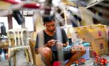 Pengerajin mengerjakan pesanan miniatur untuk ekspor di Walidi Craft, Yogyakarta, Jumat (17/9). Walidi Craft sempat menghentikan produksi miniatur saat PPKM Darurat lalu. Kini pengerajin miniatur kembali mendapat pesanan dari Belanda. Miniatur sepeda, Vespa, dan becak menjadi item pesanan mereka. Sedangkan untuk pasar lokal, pesanan miniatur masih sangat sedikit. (FOTO : Wihdan Hidayat / Republika)
