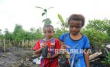 Dua anak memegang bibit pohon Mangrove di Kampung Maibo, Kabupaten Sorong, Papua Barat, Jumat (17/9/2021). Kegiatan tersebut untuk merestorasi kerusakan hutan Mangrove di Papua Barat seluas 40.000 hektar dan yang kritis sebesar 15.000 hektar. (FOTO : Antara/Olha Mulalinda)