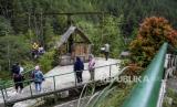 Pengunjung beraktivitas di area kawasan wisata The Lodge Maribaya, Lembang, Kabupaten Bandung Barat, Jumat (17/9). Kawasan wisata The Lodge Maribaya menjadi salah satu objek wisata yang diizinkan untuk beroperasi kembali pada masa PPKM Level 3. Kawasan wisata tersebut sekaligus menjadi wisata percontohan dalam penerapan protokol kesehatan dan penggunaan aplikasi Peduli Lindungi di masa uji coba pembukaan kawasan wisata di Kabupaten Bandung Barat. (FOTO : REPUBLIKA/ABDAN SYAKURA)