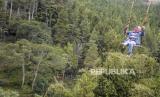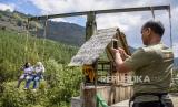 Pengunjung menaiki salah satu wahana permainan di area kawasan wisata The Lodge Maribaya, Lembang, Kabupaten Bandung Barat, Jumat (17/9). Kawasan wisata The Lodge Maribaya menjadi salah satu objek wisata yang diizinkan untuk beroperasi kembali pada masa PPKM Level 3. Kawasan wisata tersebut sekaligus menjadi wisata percontohan dalam penerapan protokol kesehatan dan penggunaan aplikasi Peduli Lindungi di masa uji coba pembukaan kawasan wisata di Kabupaten Bandung Barat. (FOTO : REPUBLIKA/ABDAN SYAKURA)
