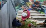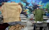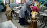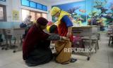 Siswa kelas 1 bersama orang tuanya mencoba seragam sekolah ketika pengambilan seragam di SD Negeri Anyelir 1 Depok, Jawa Barat, Jumat (17/9). Menurut pihak sekolah rencananya pada Senin (20/9) SD Negeri Anyelir 1 akan melakukan uji coba Pembelajaran Tatap Muka Terbatas (PTMT) dengan menerapkan protokol kesehatan ketat. (FOTO : Prayogi/Republika.)