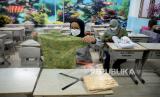 Sorang guru mengambil seragam sekolah ketika pengambilan seragam olah para orang tua di SD Negeri Anyelir 1 Depok, Jawa Barat, Jumat (17/9). Menurut pihak sekolah rencananya pada Senin (20/9) SD Negeri Anyelir 1 akan melakukan uji coba Pembelajaran Tatap Muka Terbatas (PTMT) dengan menerapkan protokol kesehatan ketat.Prayogi/Republika. (FOTO : Prayogi/Republika.)