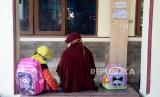 Siswa kelas 1 bersama orang tuanya menunggu untuk mengambil seragam di SD Negeri Anyelir 1 Depok, Jawa Barat, Jumat (17/9). Menurut pihak sekolah rencananya pada Senin (20/9) SD Negeri Anyelir 1 akan melakukan uji coba Pembelajaran Tatap Muka Terbatas (PTMT) dengan menerapkan protokol kesehatan ketat.Prayogi/Republika. (FOTO : Prayogi/Republika.)
