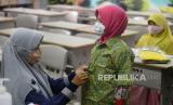 Siswa kelas 1 bersama orang tuanya mencoba seragam sekolah ketika pengambilan seragam di SD Negeri Anyelir 1 Depok, Jawa Barat, Jumat (17/9). Menurut pihak sekolah rencananya pada Senin (20/9) SD Negeri Anyelir 1 akan melakukan uji coba Pembelajaran Tatap Muka Terbatas (PTMT) dengan menerapkan protokol kesehatan ketat.Prayogi/Republika. (FOTO : Prayogi/Republika.)