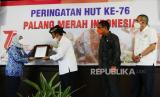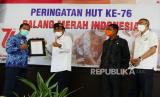 Ketua Palang Merah Indonesia (PMI) Jawa Barat Adang Rochjana di dampingi Keua PMI Kota Bandung Ade Kusjanto (kanan) memberikan piagam penghargaan kepada pihak yang berperan aktif melaksanakan donor darah saat Peringatan HUT ke-76 Palang Merah Indonesia (PMI) di kantor PMI Kota Bandung, Jalan Aceh, Jumat (17/9). Sejak pandemi Covid-19 stok darah di PMI mengalami penurunan 50 persen. Untuk menaikan kembali, PMI Kota Bandung mensosialisasikan donor darah di masa pandemi aman serta membuka layanan donor darah 24 jam. (FOTO : Edi Yusuf/Republika)