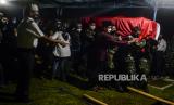 Anggota TNI membawa peti jenazah Pilot Rimbun Air Kapten Agithia Mirza saat prosesi pemakaman di TPU Taman Bahagia, Bogor, Jawa Barat, Jumat (17/9). Kapten Agithia Mirza meninggal dunia setelah Pesawat Rimbun Air dengan nomor registrasi PK OTW yang dikemudikannya bersama Co Pilot, M. Fajar Dwi Saputra serta Teknisi, Utra Iswahyudi hilang kontak dan terjatuh di Pegunungan Intan Jaya saat dalam perjalanan penerbangan dari Bandara Nabire menuju Sugapa, Kabupaten Intan Jaya. Republika/Putra M. Akbar (FOTO : Republika/Putra M. Akbar)