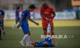 Pesepak bola Persiraja Banda Aceh Paulo Henrique (kanan) membantu pesepak bola PSIS Semarang Alfeandra Dewangga (tengah) yang mengalami kram kaki dalam pertandingan pekan ketiga Liga 1 2020-2021 di Stadion Wibawa Mukti, Cikarang, Kabupaten Bekasi, Jawa Barat, Sabtu (18/9/2021). Pertandingan dimenangkan PSIS Semarang dengan skor 3-1. (FOTO : Antara/Aditya Pradana Putra)